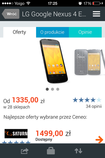 Ceneo działa bardzo dobrze i szybko. Nawigacja aplikacji jest świetnie zaprojektowana, dzięki czemu łatwo można odnaleźć daną rzecz. Interfejs opiera się na wysuwanych kartach i zakładkach, które wprowadzają porządek do tej ogromnej bazy. Ceneo jest również bardzo czytelne.
